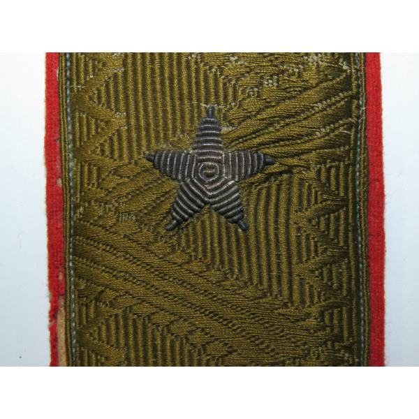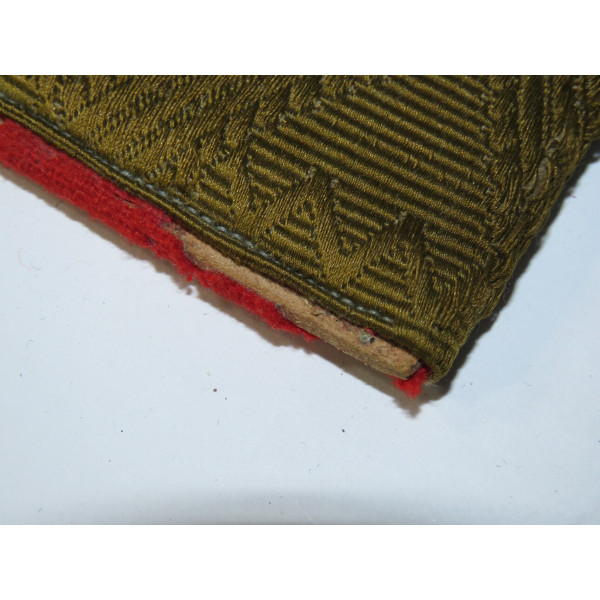 Major General RKKA shoulder board, 1943 pattern, with khaki braid field on red cloth backing, backing shows moth damage, star embroidered with silver bullion thread darkened with age, good condition.