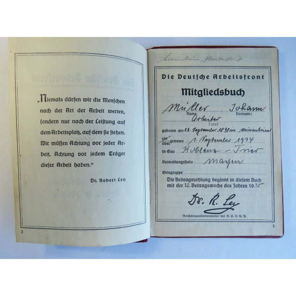 Membership booklet of the Deutsche Arbeitsfront (DAF), issued to Johann Müller, profession worker, born on September 22, 1898. The document is dated September 1, 1934, and registered in Gau Koblenz–Trier. The cover bears the gold-embossed emblem of the organization – a cogwheel with a swastika in the center. Inside are dues stamps in different colors. The booklet shows signs of use but has been fully preserved.