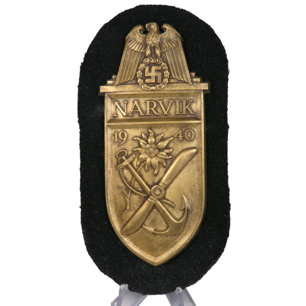 Original 1940 Narvik campaign sleeve shield awarded to Kriegsmarine personnel. Made of die-stamped CupAl (aluminum with copper coating) with full original gilding and light patina. Mounted on dark blue wool with matching blue underlay, as issued for naval uniforms. The reverse features typical period mounting. Manufactured by Deumer. Excellent collector condition.