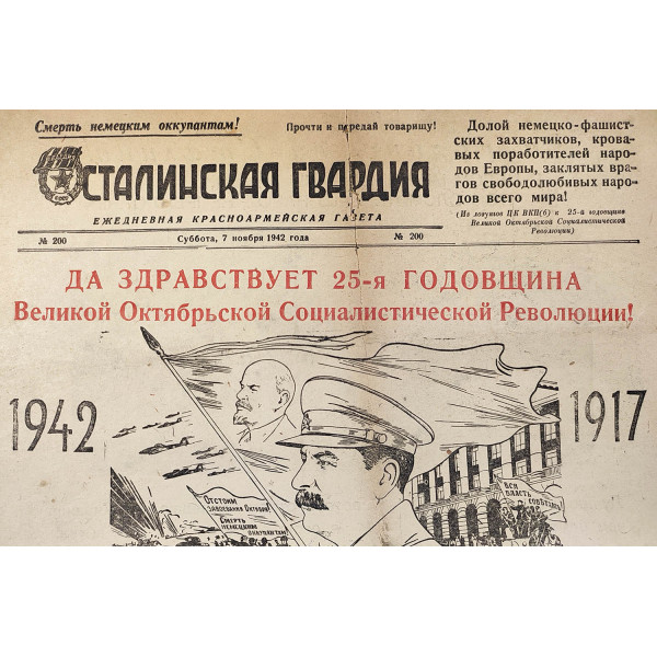 The Soviet people are a victorious people. Their heroes are fighting in Stalingrad, in the Caucasus, near Leningrad, near Rzhev, and on all fronts. Let the 25th anniversary of October be a day of oath: an oath to fight for every meter of land, turning it into hell for the enemy!