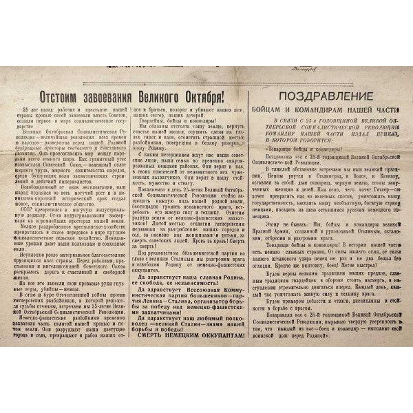 Comrades soldiers and commanders! I congratulate you on the 25th anniversary of the Great October Socialist Revolution! Great October opened the path to freedom for the peoples. Today, in the days of the great war against fascism, on this solemn day, we especially deeply realize what we are fighting for. We are fighting for the cause of Lenin and Stalin, for the socialist Motherland, for the future of the peoples. Let every soldier, every officer, swear on this day to beat the fascists mercilessly, ruthlessly, until complete destruction! Every one of our efforts, every cartridge, every battle, every step—everything on the altar of victory!