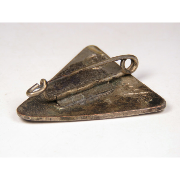 Nationalsozialistische Frauenschaft (NSF) membership badge, 8th form. Diameter 23 mm. Triangular enamel badge with Frauenschaft inscription, pinback construction. RZM M1/93 marked. Manufactured by Gottlieb Friedrich Keck & Sohn, Pforzheim. Uncleaned condition, no losses. Minor age-related surface dirt present.