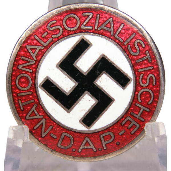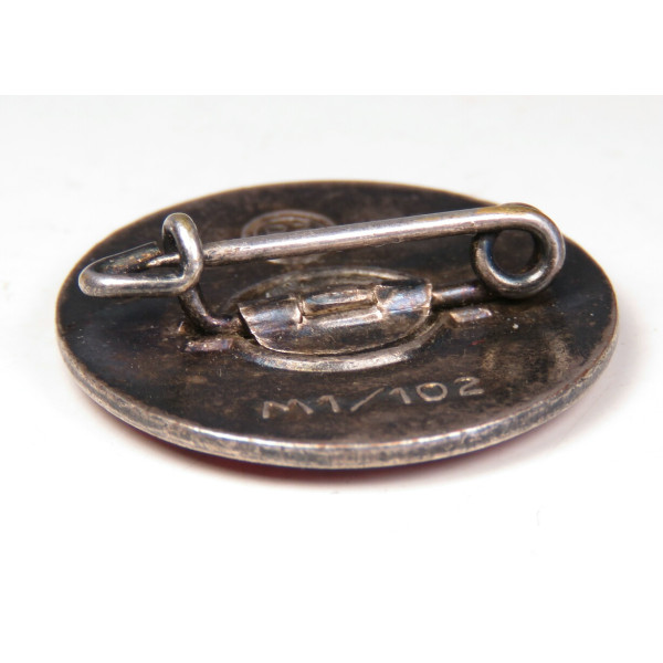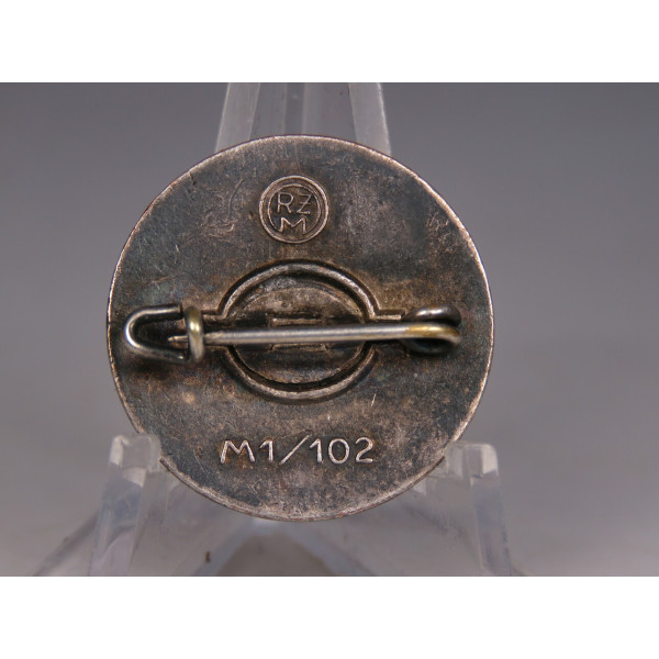 NSDAP party badge marked RZM M1/102 corresponding to the maker Frank & Reif, Stuttgart. Made of non-ferrous metal with silver plating and enamel finish in excellent condition. The obverse shows only a few minor light scratches that do not affect the overall appearance. Overall condition excellent.
