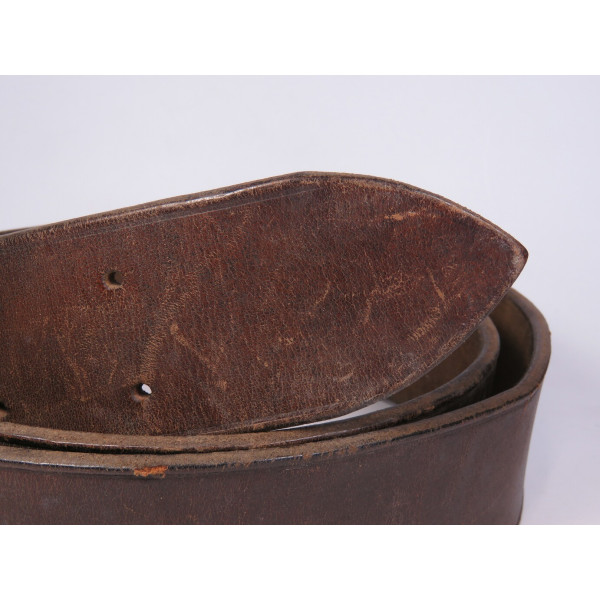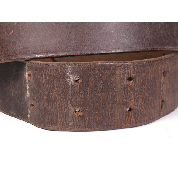 Brown leather belt of NSDAP units with a zinc buckle, in very good condition. Marked on the leather: RZM L2/256/3. Total length from the pin to the last hole is 115 cm, minimum adjustable length is 90 cm. Two additional rows of holes were added by the original owner during use. The reverse side of the buckle shows minor corrosion, not visible when worn. The leather is thick, firm, and free of cracks, remaining flexible and suitable for wear