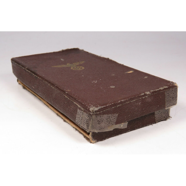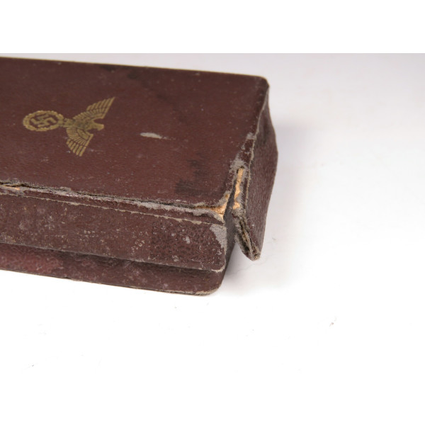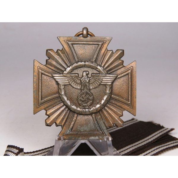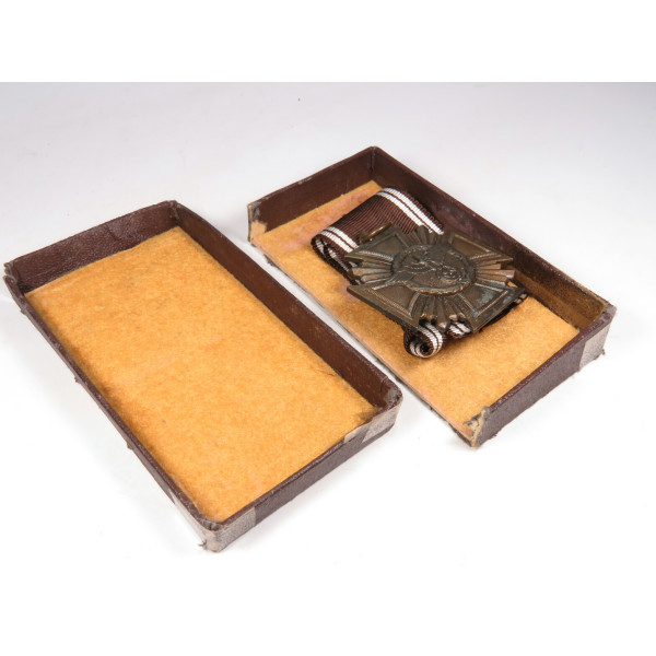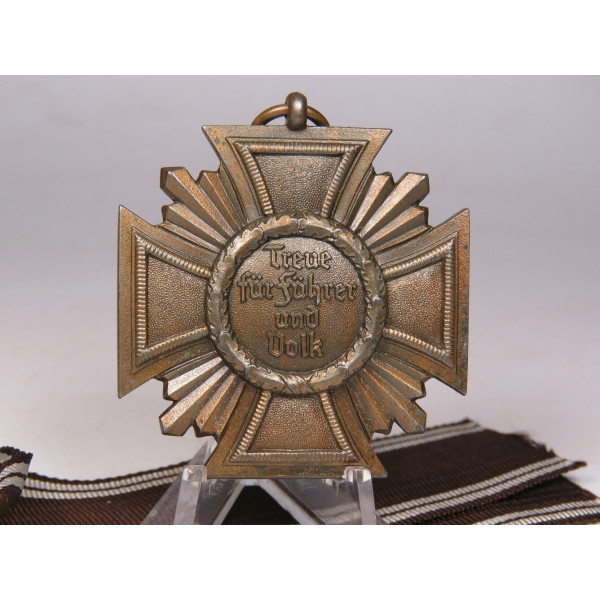 NSDAP Dienstauszeichnung 1. Stufe in Bronze. Heavy zinc construction with applied medallion and bronze finish. Complete with long ribbon and case, case base marked RZM M1/34, manufactured by Karl Wurster, Markneukirchen. The cross is in excellent condition. Unfortunately, the case has dmages and one part of the case is missing.