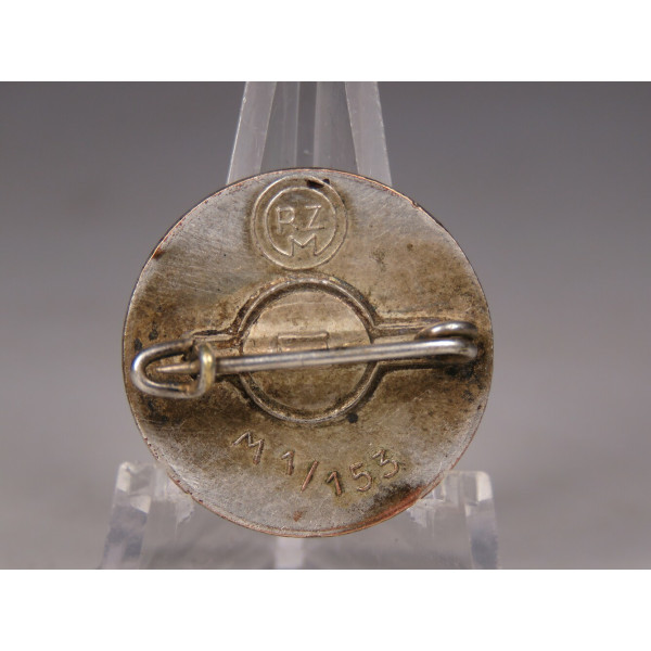 NSDAP party badge featuring the distinctive carrot-colored enamel. The badge is in ideal condition, showing only minimal patina on the reverse. The enamels are crisp and vibrant, with no chips or losses. The badge has a silvered finish. The reverse is marked RZM M1/153, corresponding to the manufacturer Friedrich Orth, Vienna. This example belongs to post-1939 wartime production following the Anschluss of Austria. After 1939, many Austrian firms were granted RZM licenses, as a result of which Austrian manufacturers began producing NSDAP party badges, including this type. An extremely rare badge by this specific manufacturer, preserved in outstanding condition.
