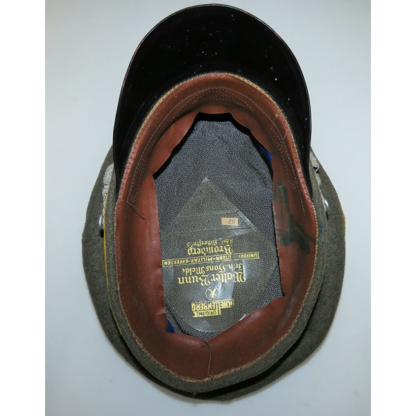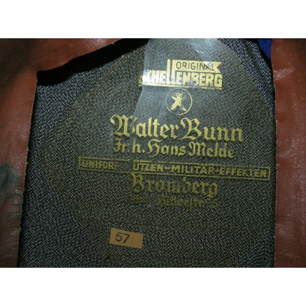 The interior maker’s marking reads: Original Schellenberg, Walter Bunn, Inh. Hans Melde, Uniform–Mützen–Militär–Effekten, Bromberg, Adolf Hitlerstrasse 25.