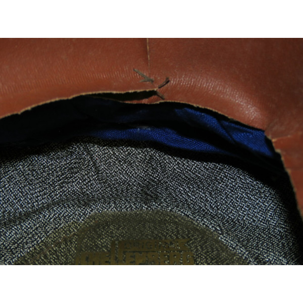 The bright yellow felt piping shows areas of moth damage yet retains its strong color and authentic appearance. The sweatband stitching remains intact and undamaged.