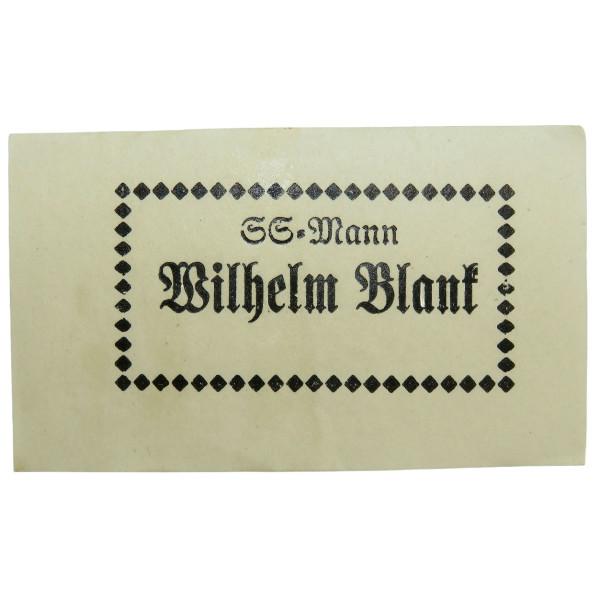 Original paper tag used for labeling SS-issued equipment such as steel helmets, gas mask canisters, mess kits, and other personal gear. The handwritten note SS-Mann Wilhelm Blank identifies the item as belonging to an SS enlisted man. These tags were attached to gear prior to distribution or transport and served as temporary identifiers, particularly in peacetime or early wartime periods. The paper has a typical yellowed base tone, and the writing is clear and well-preserved. We have few tags in stock. All in same perfect mint condition. Price is for 1 pcs.