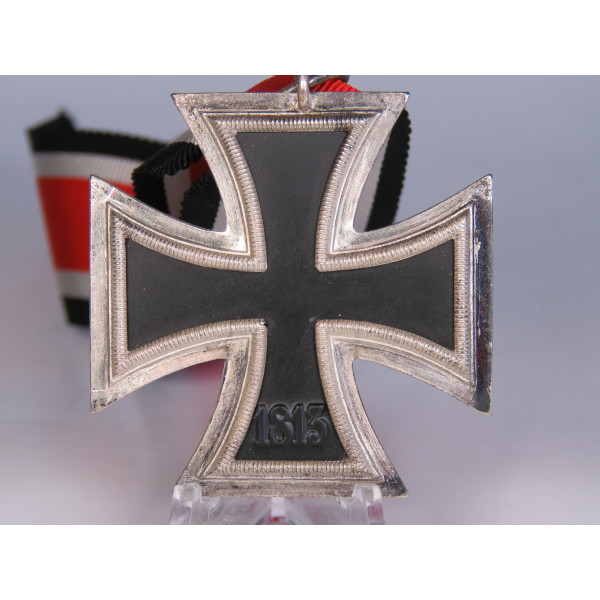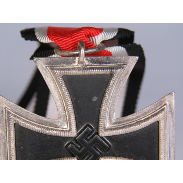 Iron Cross 2nd Class, 1939 issue, manufactured by Richard Simm & Söhne, Gablonz. The cross is in excellent condition with fully preserved black paint finish. Comes with a full-length original ribbon measuring 29 cm. A small spot appears on the obverse in the photo but is not present in reality. A fine example of quality craftsmanship from a less common maker. An excellent collectible piece. PKZ 93 marked ring