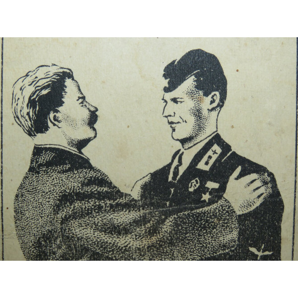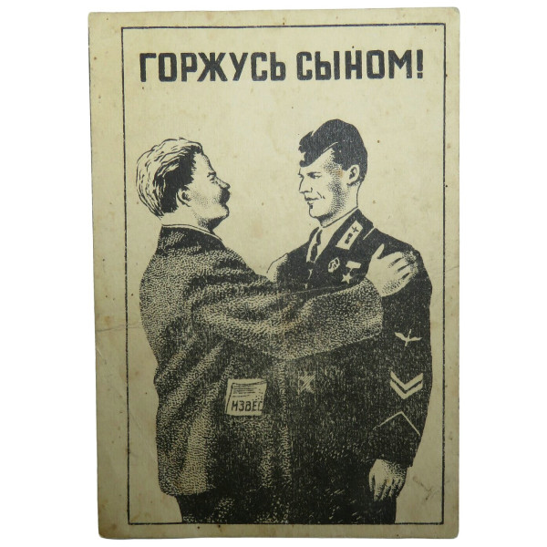Soviet wartime postcard issued during the patriotic campaign in support of the Red Army. The front depicts Joseph Stalin congratulating his son, an Air Force officer of the Red Army, decorated with medals and rank insignia. The caption above reads “Proud of My Son!”, symbolizing both personal pride and the collective image of a Soviet father whose son defends the Motherland.