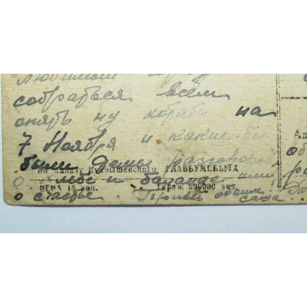 A rare wartime postcard featuring Stalin and his pilot son, bearing an original postal cancellation “Krasnodar, May 10, 1944.” Excellent collector’s condition.