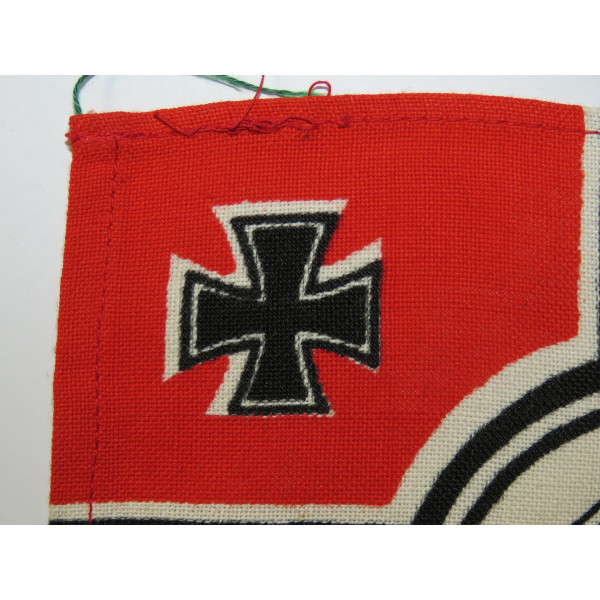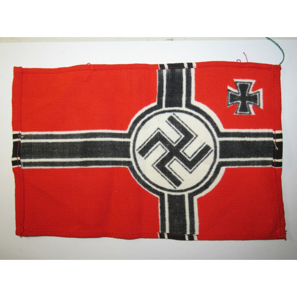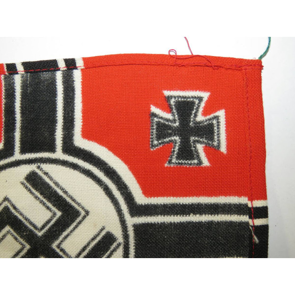 Small desk flag made in the form of the Reichskriegsflagge, the German war and military flag. Produced from the same type of textile material used for full-size flags of this pattern. Single-sided construction. Size is 25 × 16 cm. No damage, excellent condition.