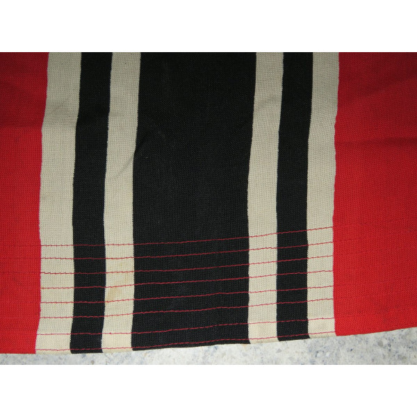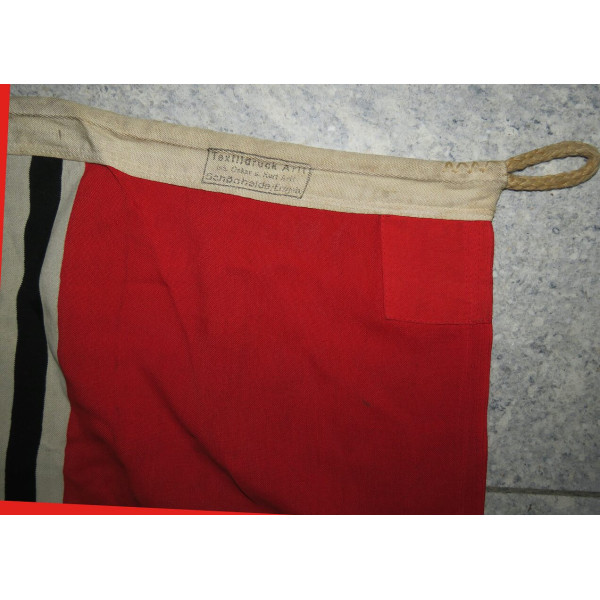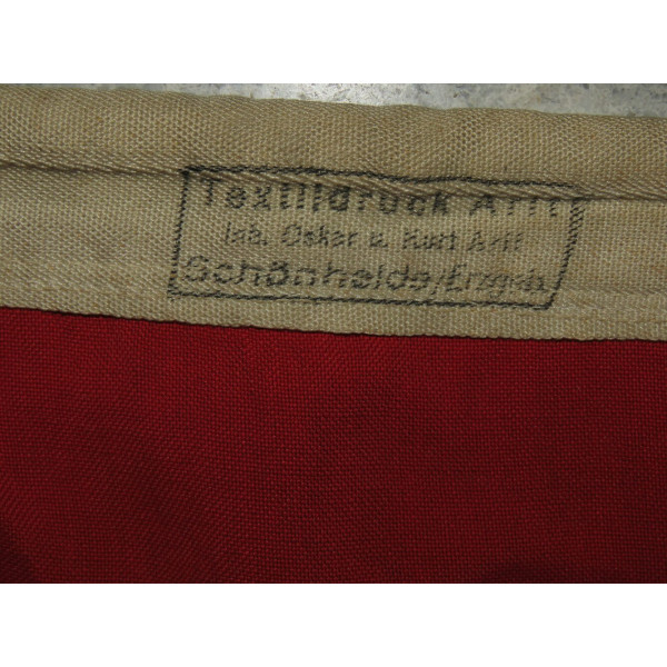 Reichskriegsflagge measuring 80 × 135 cm, marked KR.FL.80x135, with manufacturer’s stamp Textildruck Arlt, Inh. Oskar u. Kurt Arlt, Schönheide Erzgebirge. A flag with true character — having absorbed the dust of past battles. Shows minor wear, light soiling, and a few small field tears from actual use. The absence of the eagle with the letter "M" indicates use by Wehrmacht ground forces rather than the Kriegsmarine. A powerful addition to any collection of historically field-used artifacts.