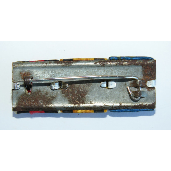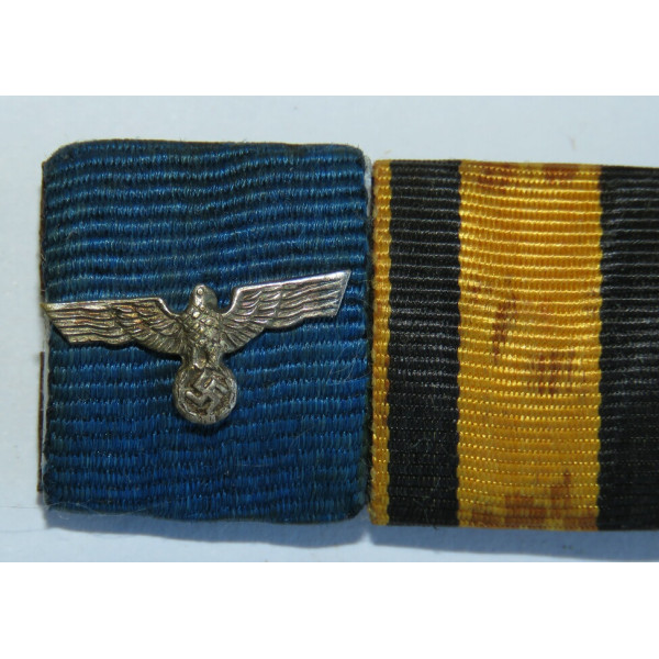 Ribbon bar of three awards belonging to a veteran of both World Wars. It includes the Wehrmacht Long Service Medal for 12 years on a blue ribbon with a golden eagle, the Württemberg Military Merit Cross from the First World War, and the Medal for the Annexation of the Sudetenland in 1938. The bar shows traces of wear and reflects the career of a front-line soldier who began his service in the Württemberg Army, continued in the Wehrmacht, and took part in the annexation of the Sudetenland.