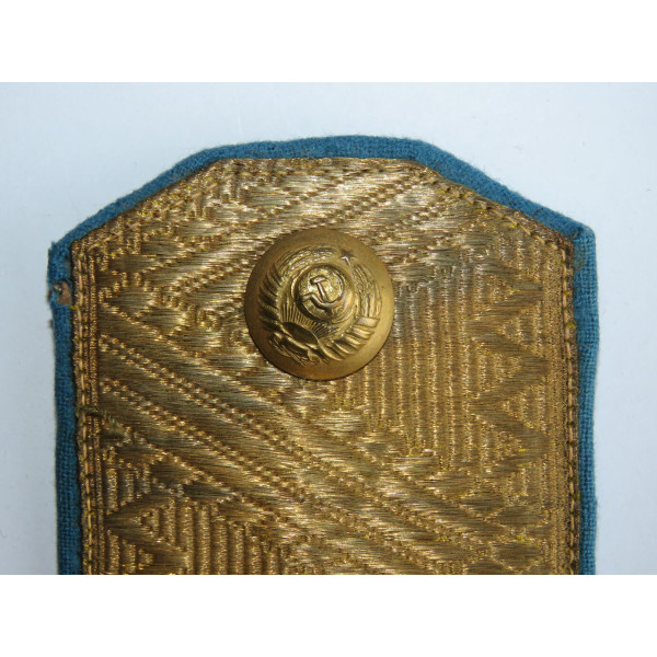 Wartime issue shoulder board of a Major General of Aviation. The golden field with light-blue backing bears a silver bullion-embroidered star. The shoulder board is completed with a USSR button featuring the eleven-republic emblem.
