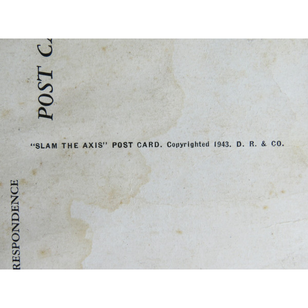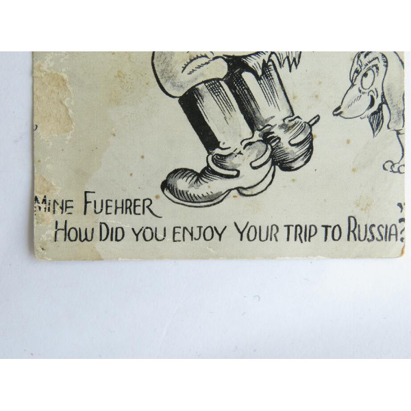 Редкая антифашистская почтовая открытка с сатирическим изображением Гитлера после провала похода на Россию. На открытке изображён карикатурный Гитлер с разорванными штанами и свастикой, рядом с ним собака. В нижней части надпись на английском языке: