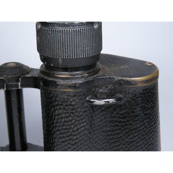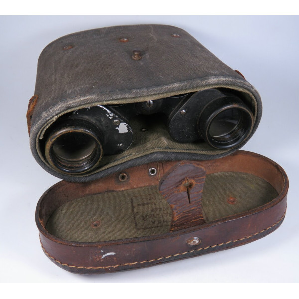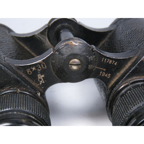 Бинокль Красной Армии выпуска 1945 года с оригинальным кожаным чехлом, имеющим более раннюю маркировку — 194... год, последняя цифра неразборчива. Оптика чистая и светлая, механика работает плавно. Классическая модель 6x30, применявшаяся офицерами и артиллеристами РККА в завершающий период войны. Отличное состояние как корпуса, так и оптики.