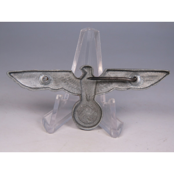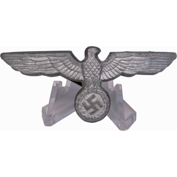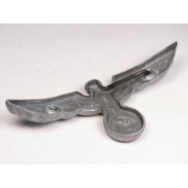 Цинковый орёл для фуражки вермахта на период середина – конец войны. Военный штампованный вариант с характерной для позднего времени технологией изготовления. Один крепеж отсутствует.