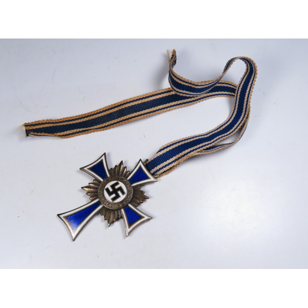 Бронзовый Крест немецкой матери (Ehrenkreuz der Deutschen Mutter), учреждённый 16 декабря 1938 года Адольфом Гитлером для награждения женщин, родивших и воспитавших четырёх и более детей. Крест покрыт голубой и белой эмалью, в центре надпись Der Deutschen Mutter. На реверсе дата учреждения 16.12.1938 и факсимиле подписи Адольфа Гитлера. Изготовлен из бронзы, с оригинальной лентой. Отличное состояние.