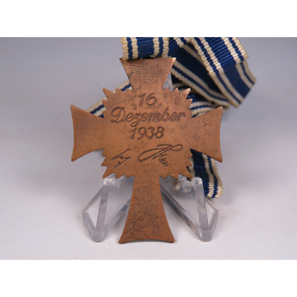 На аверсе — надпись „Der Deutschen Mutter“, на реверсе — дата учреждения „16. Dezember 1938“ и факсимиле подписи Адольфа Гитлера. Отлично сохранившийся экземпляр одной из самых массовых, но в то же время значимых наград идеологической системы Третьего рейха.
