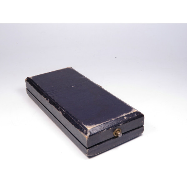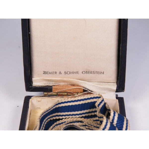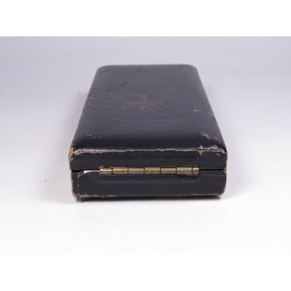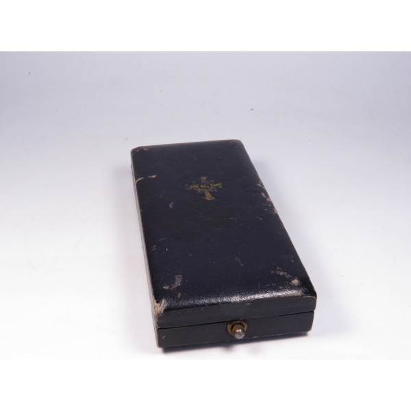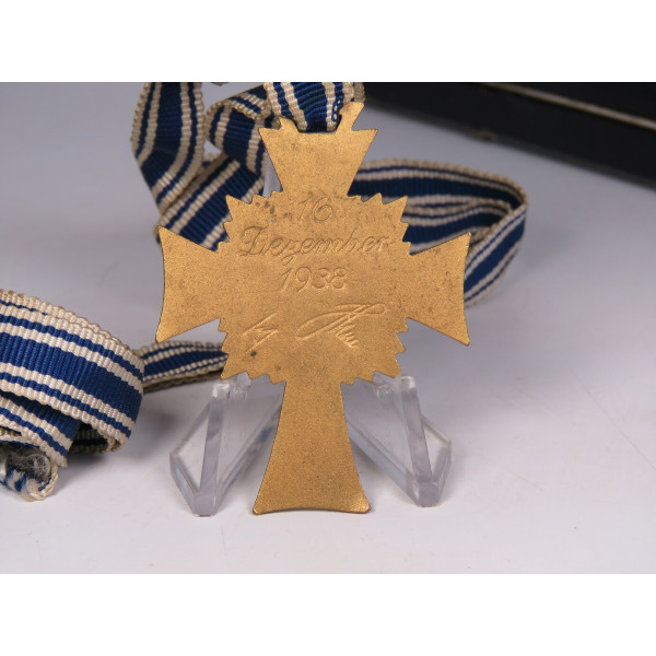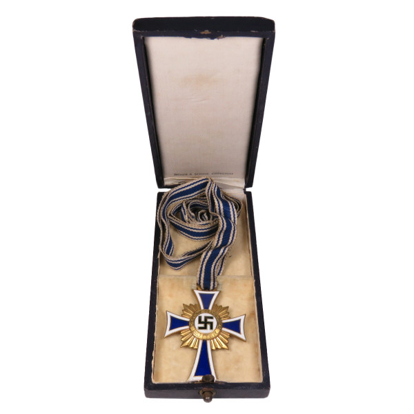 Крест матери Германии первой степени (1. Stufe) в золотом исполнении, вручавшийся женщинам, воспитавшим восемь и более детей. Крест в оригинальном футляре фирмы Ziemer & Söhne, Oberstein. На реверсе — дата учреждения: 16 Dezember 1938 и факсимиле подписи Гитлера. Крест с лёгкой патиной, имеется небольшое повреждение эмали в области нижнего луча — тонкие, едва заметные трещины. Футляр с характерной бархатной подложкой и маркировкой на внутренней стороне крышки, в районе крепления петли заметно небольшое повреждение. В целом хорошо сохранившийся комплект.