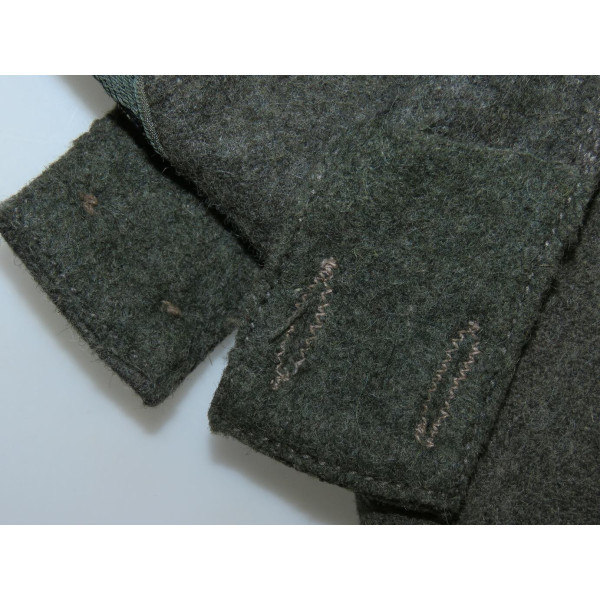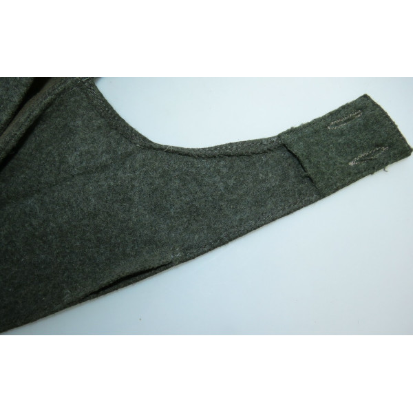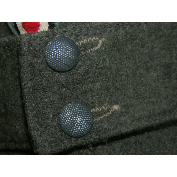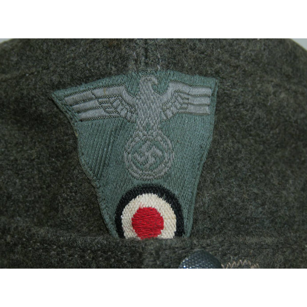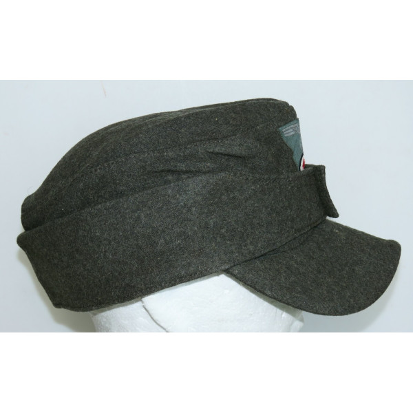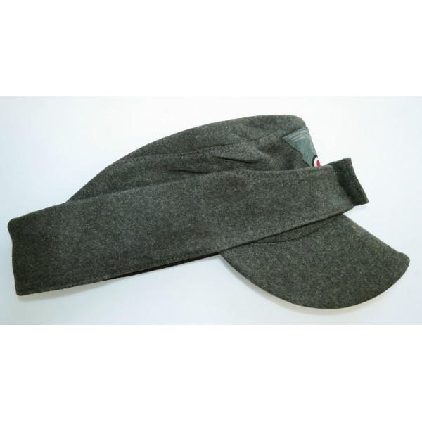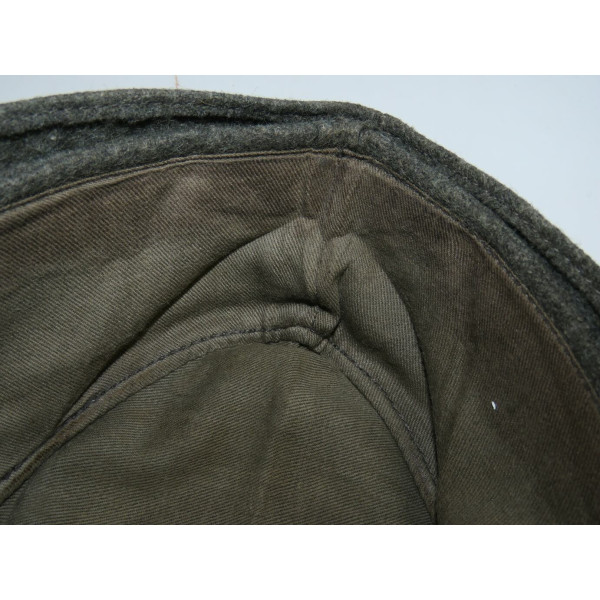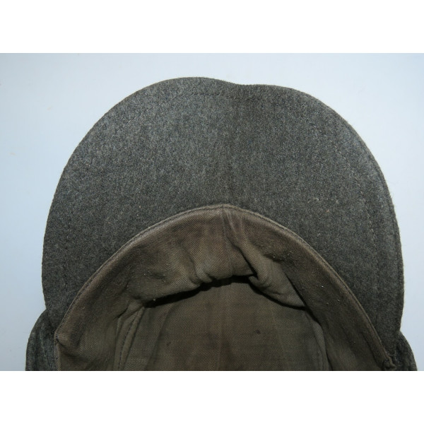 Кепка Feldmütze образца 1943 года (M43) выполнена из сукна цвета Feldgrau. На подкладке имеется маркировка производителя в закодированном виде RB Nr. 0/0496/0764 и размер 59. Кепка соответствует всем характерным особенностям данного производителя. Состояние превосходное, со следами фронтового бытования и слегка засаленной подкладкой. Оснащена стальными пуговицами с шагренью, окрашенными в поздний серый цвет. Повреждений от моли и времени нет.
