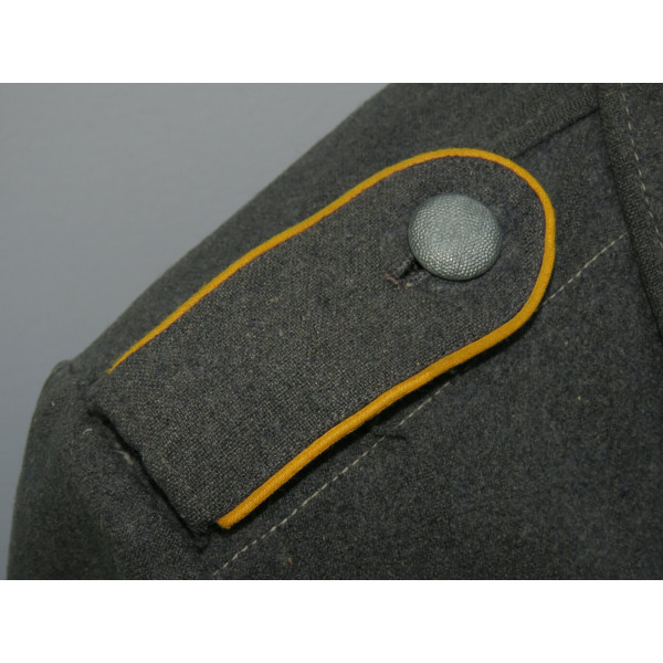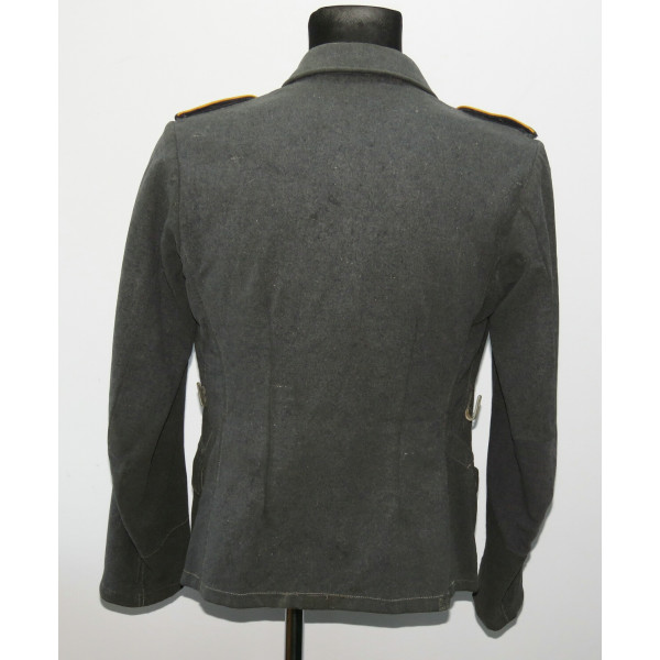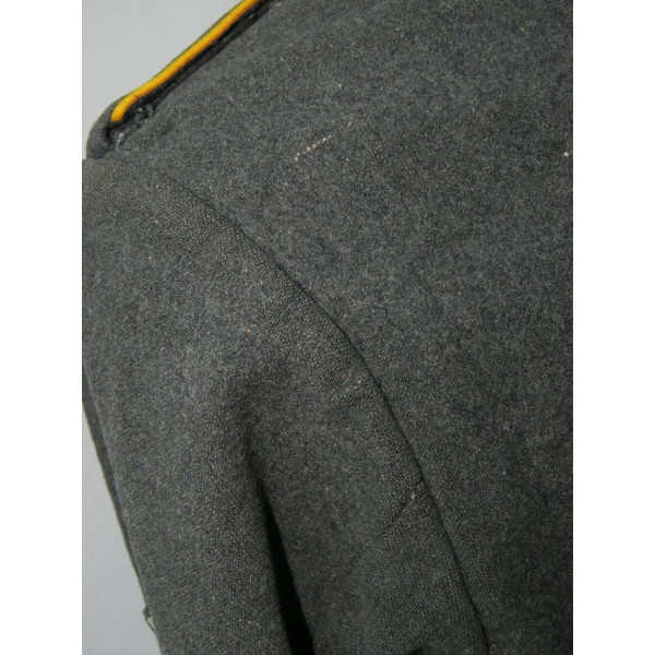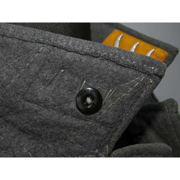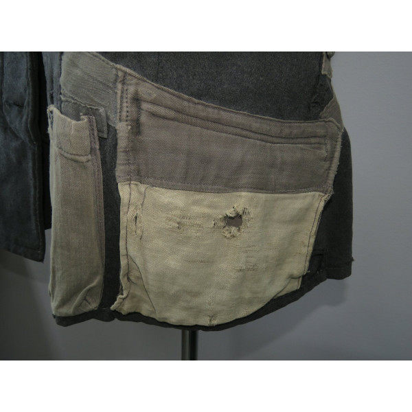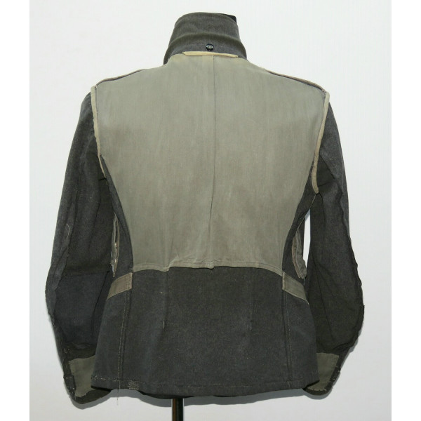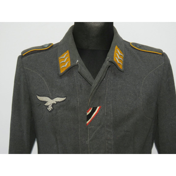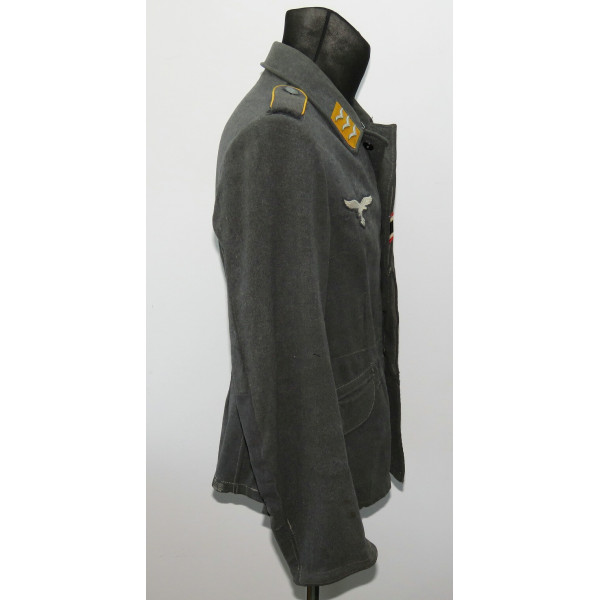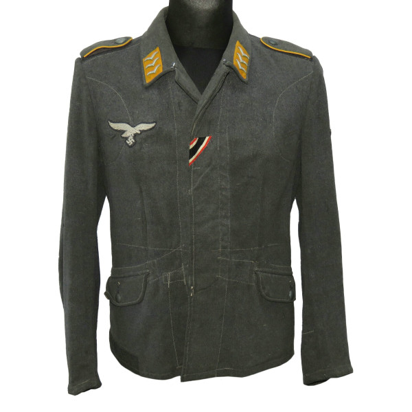 Китель типа Fliegerbluse для лётно-подъёмного состава или парашютистов Люфтваффе в звании обер-ефрейтора. Имеет выраженные следы боевого бытования и многочисленные фронтовые ремонты, придающие предмету насыщенный антураж и исторический характер. Все знаки различия установлены по-родному, включая нагрудный орёл, петлицы и шеврон звания. Следов моли нет, только потёртости и аккуратные полевые ремонты. Китель, предположительно, 1942 года выпуска, однако маркировки утрачены в результате ношения. Размер приблизительно 50.