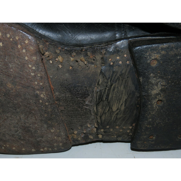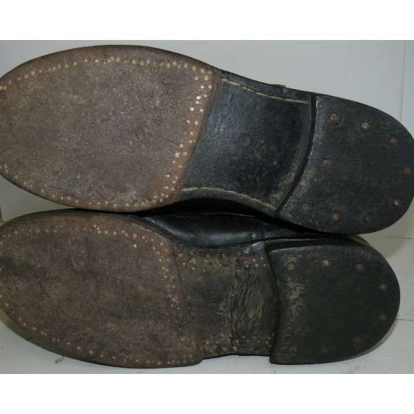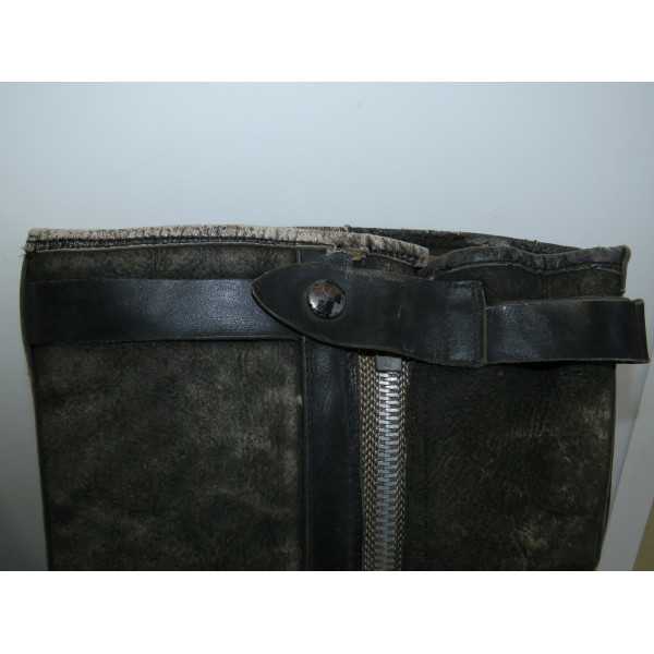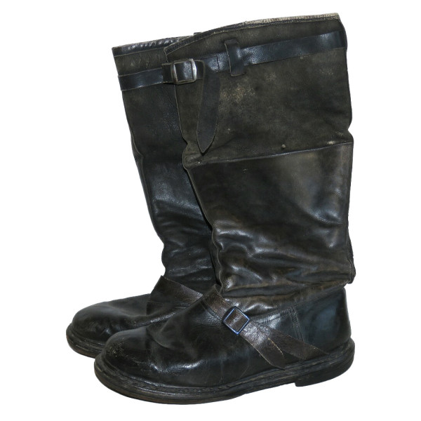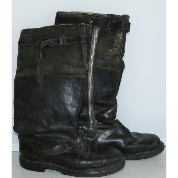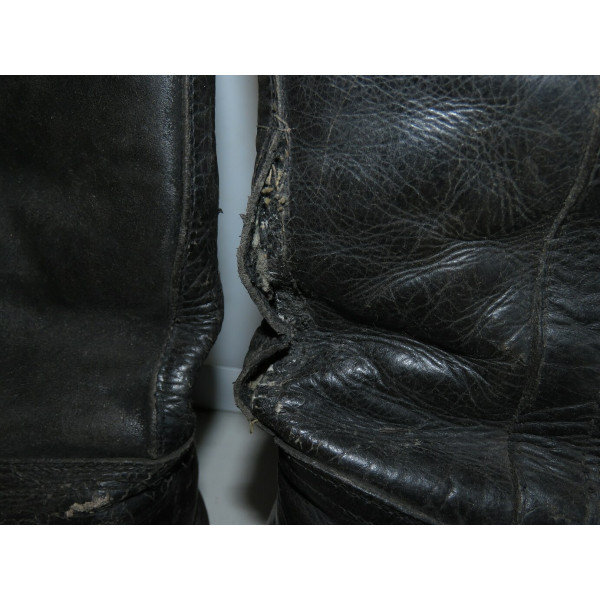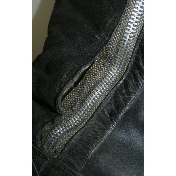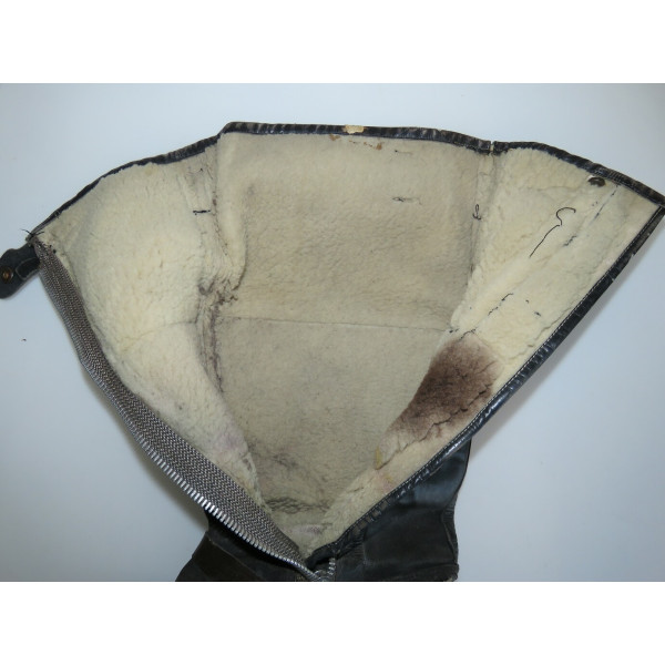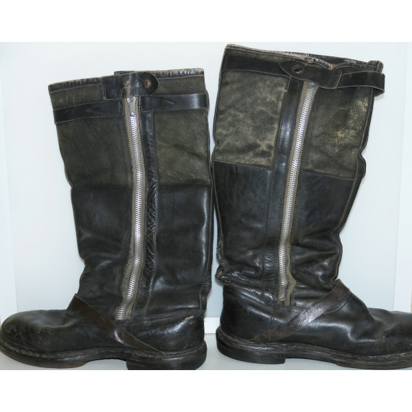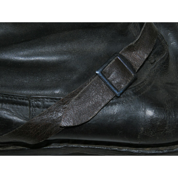 Сапоги лётные Люфтваффе, использовавшиеся пилотами и экипажами. Ношеное состояние, чёрного цвета, размер 28,5, маркировка на подошве. Застёжка-молния из алюминия функционирует, шов у щиколотки разошёлся, легко восстановить. Задняя кожаная шлея пятки имеет небольшой дефект шва.