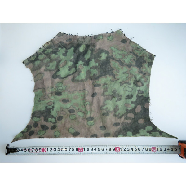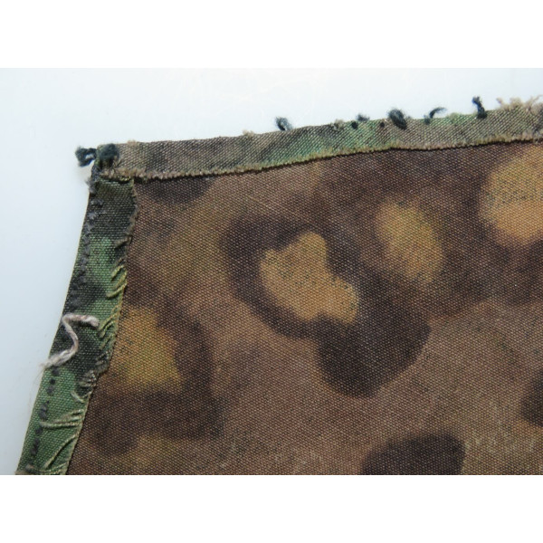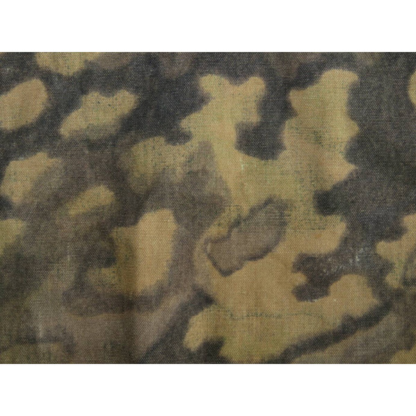 Кусок материала Waffen-SS с рисунком Eichenlaubtarn (дубовый лист). Вероятнее всего, отпорот от куртки, предположительно из задней части спины. Краски сохранились хорошо, узор остаётся чётким, присутствуют следы бытования