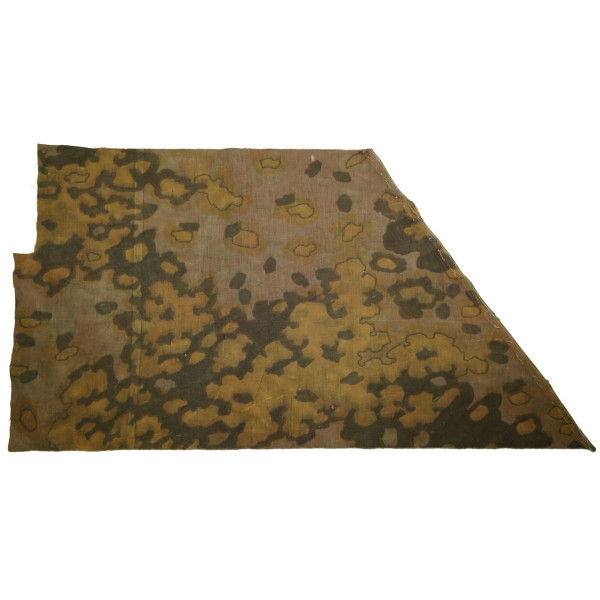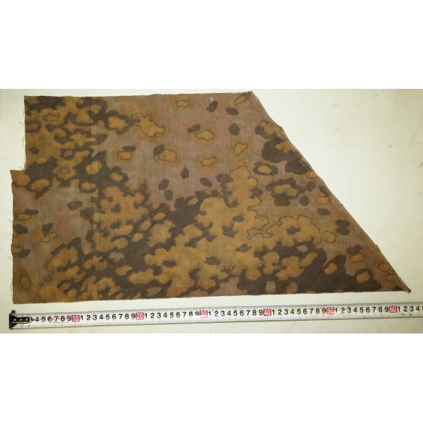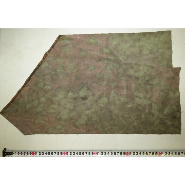Крупный кусок камуфлированной ткани Waffen-SS в расцветке Eichenlaubmuster (дубовый лист), со значительными следами полевого использования. Летняя сторона сильно изношена — рисунок практически стёрт и едва различим. Осенняя сторона частично сохранилась, общая структура ткани стабильна. Пример интенсивно использованного образца, представляющий интерес для реконструкции и изучения.