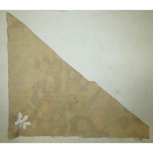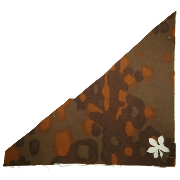 Фрагмент оригинальной камуфлированной ткани Waffen-SS с односторонним рисунком Platanentarn (платановый камуфляж), осенняя версия. Материал без следов использования, с прекрасно сохранившимися красками и чётким рисунком. Характерная структура ткани указывает на применение в пошиве камуфлированной униформы. Отличное состояние, без утрат и загрязнений.
