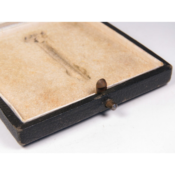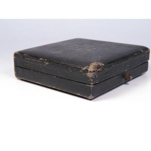 Оригинальный футляр для Eisernes Kreuz 1. Klasse 1939 года, изготовленный фирмой Wilhelm Deumer K.G., Lüdenscheid. Классический футляр, покрытый чёрным материалом с текстурой под кожу, с характерной застёжкой-кнопкой на передней части. Внутри — бархатное ложе для размещения креста и атласная белая подкладка верхней крышки. Футляр имеет лёгкие следы бытования и небольшие повреждения по краям, что типично для подлинных экземпляров времён Великой Отечественной войны. Общее состояние отличное, идеально подходит для дополнения коллекционного комплекта Железного креста 1-го класса.