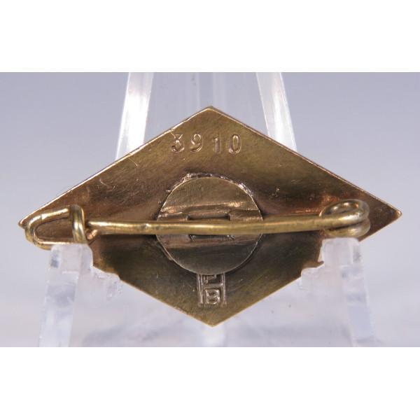 Нагрудный знак Goldenes HJ Ehrenzeichen (Золотой почётный знак Гитлерюгенда), раннего выпуска до введения стандарта RZM. Имеет маленький номер 3910, что характерно для ранних партий награждений. На реверсе нанесено клеймо производителя в виде перекрещивающихся букв FHB, соответствующих фирме Ferdinand Hoffstätter, Bonn. Знак выполнен в золочении, в превосходном состоянии, с яркими, насыщенными цветами эмали. На нижнем луче ромба имеется небольшая трещина на эмали, не влияющая на общее визуальное восприятие. Высококачественный и коллекционно привлекательный экземпляр раннего выпуска Goldenes HJ Ehrenzeichen.