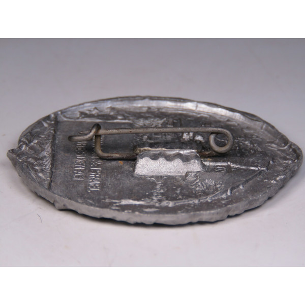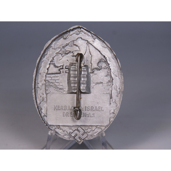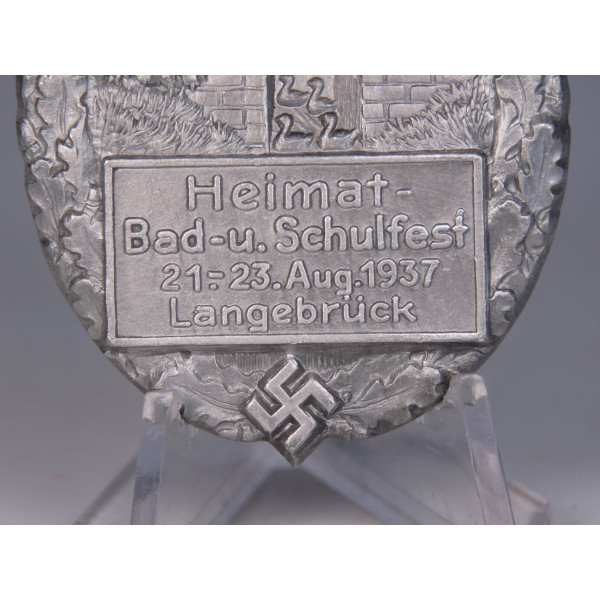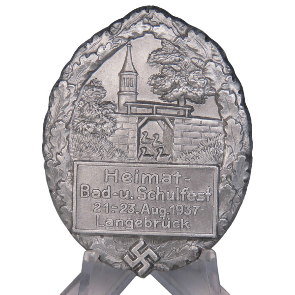 Овальный памятный значок, выпущенный к празднику, проходившему 21–23 августа 1937 года в Лангебрюке, близ Дрездена. В центре изображён городской фрагмент с башней, обрамлённый дубовым венком. Ниже — надпись: Heimat-, Bad- u. Schulfest 21.–23. Aug. 1937 Langebrück, под которой помещена небольшая свастика. Подобные фестивали в нацистской Германии совмещали элементы патриотических, оздоровительных и образовательных мероприятий, часто сопровождаясь пропагандистским содержанием. Знак выполнен методом штамповки из алюминия. Производитель: Kerbach & Israel, Dresden A-1. Отличное состояние.