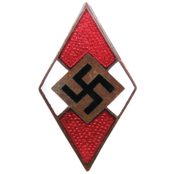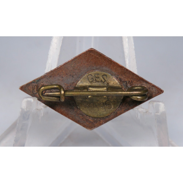 Ранний знак члена Hitlerjugend ромбовидной формы с красно-белой эмалью и чёрной свастикой в центре. Выпуск до введения стандарта RZM, на обороте на пятке крепления булавки клеймо GES. GESCH. Отличное состояние.