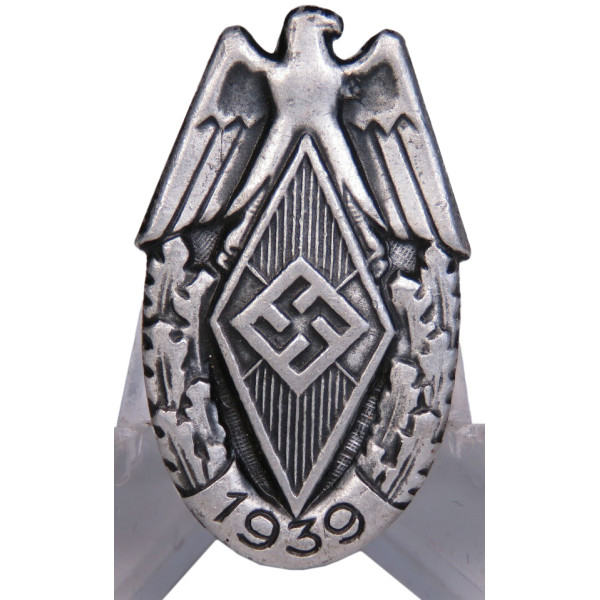 Нагрудный знак победителя спортивных соревнований Гитлерюгенда 1938 года (HJ-Reichssportwettkämpfe). Изготовлен из алюминия, на реверсе — чёткая маркировка Redo Saarlautern. Лёгкий знак с хорошо проработанными деталями, в том числе эмблемой HJ на ромбе и годом награждения. Символизирует стремление к физическому превосходству и личным достижениям в рамках идеологии Гитлерюгенда. Отличное состояние, с минимальными следами бытования.