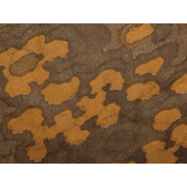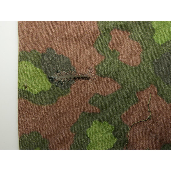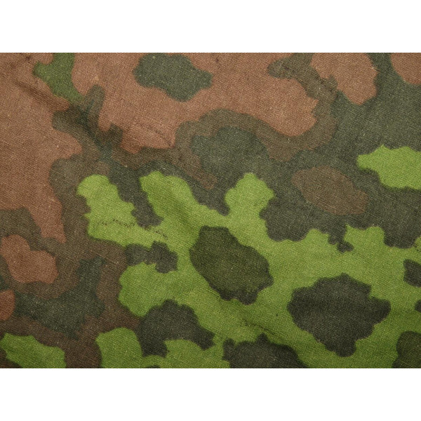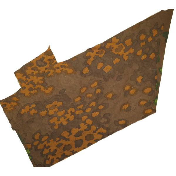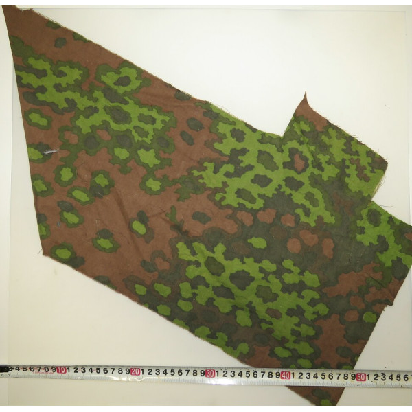Отрез камуфлированного материала Eichenlaubmuster войск СС позднего выпуска, выполненный из слегка грубоватой ткани, превосходно подходящий для ремонта и реставрации, экспонирования, а также для оформления фона под награды и любые другие предметы в рамке или на стене.