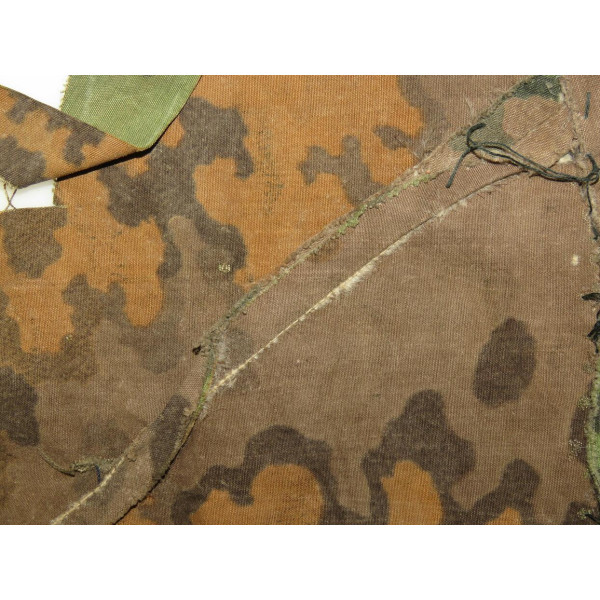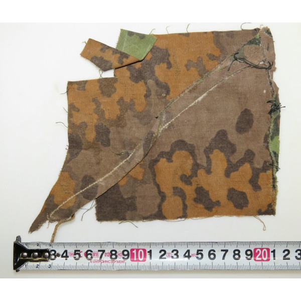 Маленький фрагмент камуфлированной ткани Eichenlaubmuster войск СС, отлично подходящий для оформления в рамке под стекло с экспонированием награды или другого предмета, благодаря выразительной палитре и читаемому рисунку.
