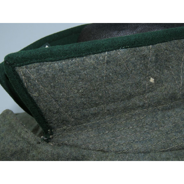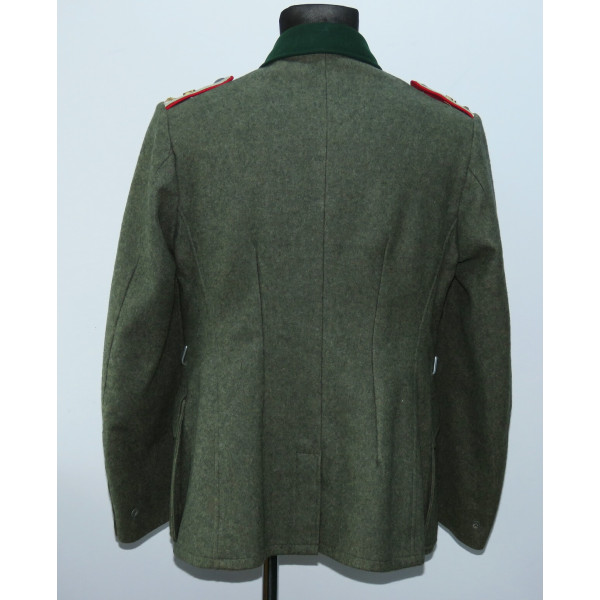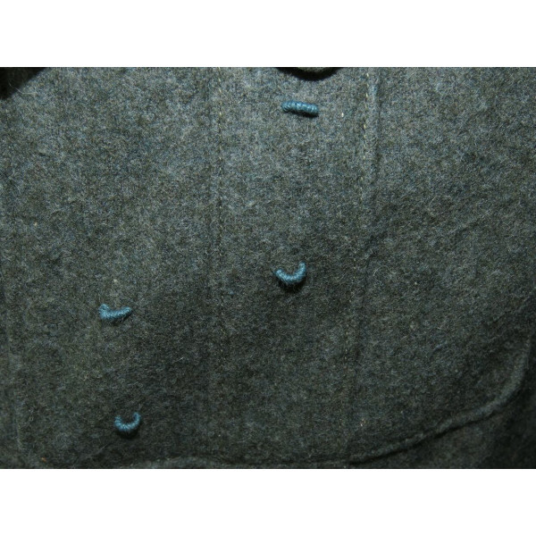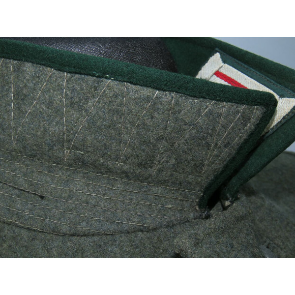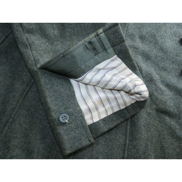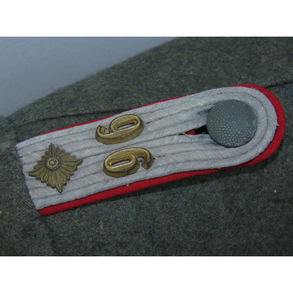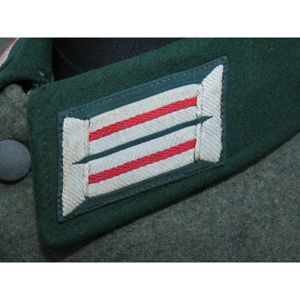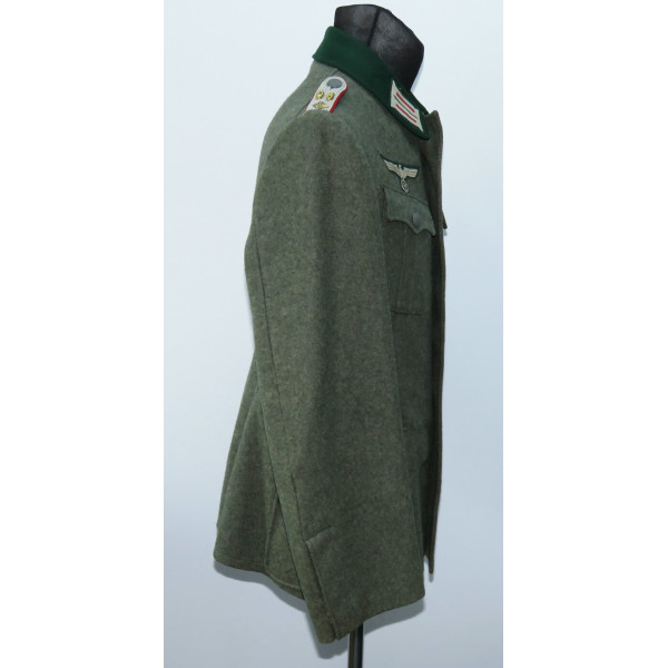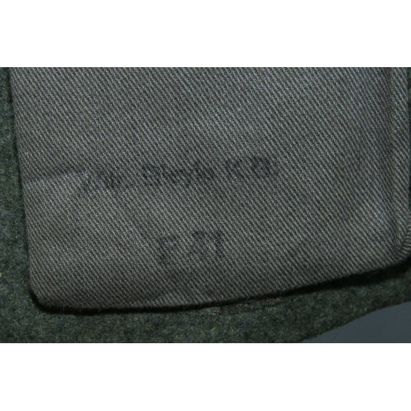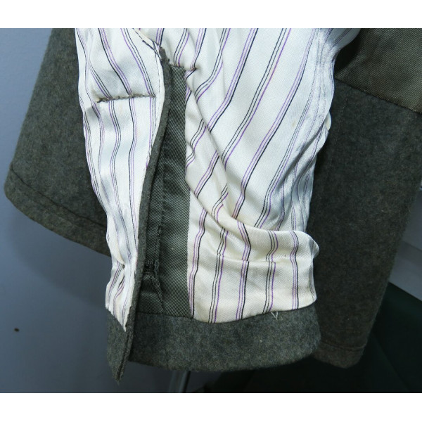 Китель командира батареи в чине обер-лейтенанта 96-го артиллерийского полка. Индивидуального пошива, переделанный из штатной армейской фельдблузы и адаптированный под офицера. Размер крупный – около 52–54. Китель в превосходном состоянии, все знаки различия установлены в тот период. Нагрудный орёл и погоны закреплены через подкладку по задумке портного, при этом нити на изнанке орла и нижняя нить на подкладке совпадают с прошивкой карманов, что подтверждает оригинальный пришив. Петлицы тканые жаккардового типа, аккуратно пришиты машинным способом. В целом это аутентичный фронтовой китель офицера с сохранившейся атмосферой периода.
