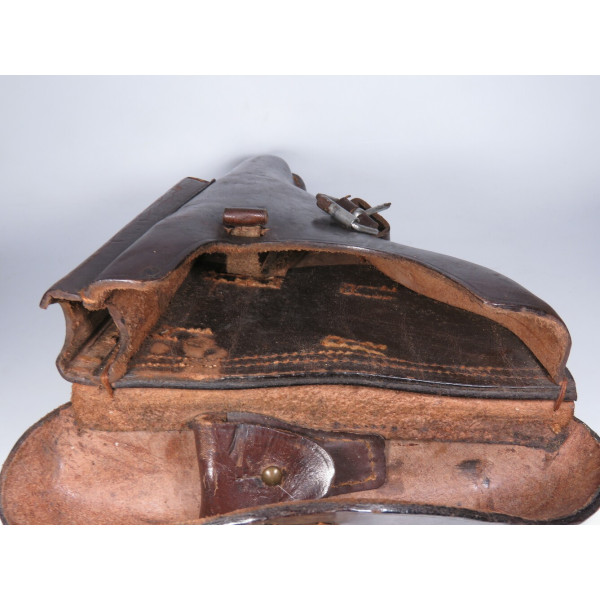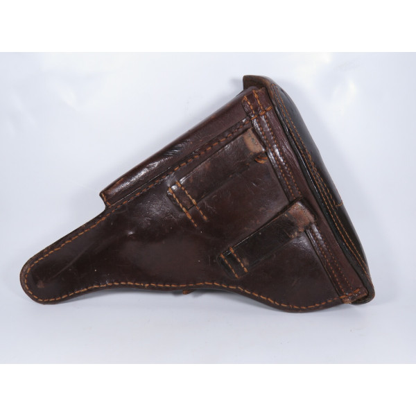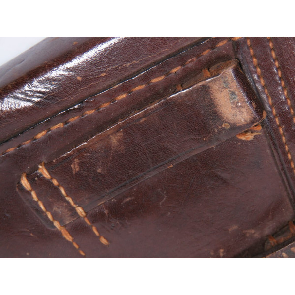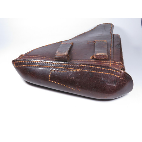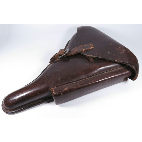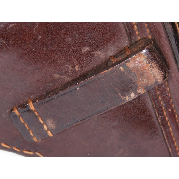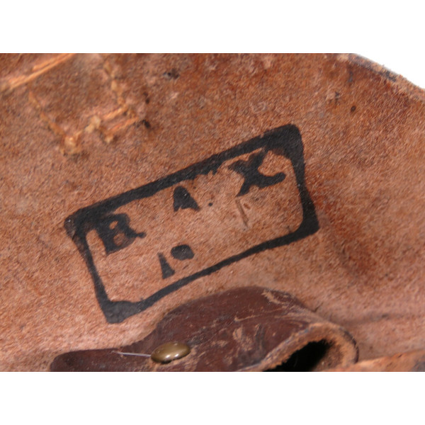Кожаная кобура к пистолету P08 Luger времён Первой мировой войны. На внутренней стороне клапана сохранилось клеймо приёмки B.A.X, что означает Bekleidungsamt 10-го армейского корпуса Германской армии. Год приёмки отмечен как «19**», последние цифры не читаются.
