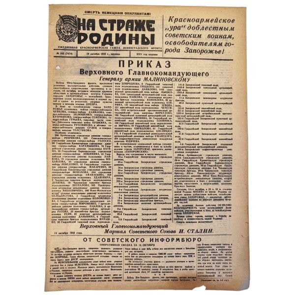 Сегодня, 14 октября, войскам, участвовавшим в боях за освобождение города Запорожье, объявляется благодарность. В ознаменование одержанной победы город Москва салютует доблестным войскам Юго-Западного фронта двадцатью артиллерийскими залпами из двухсот двадцати четырёх орудий.