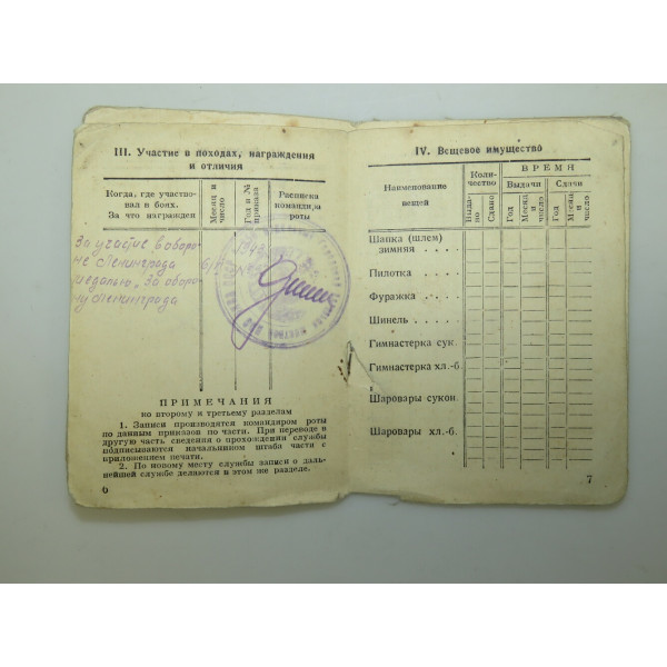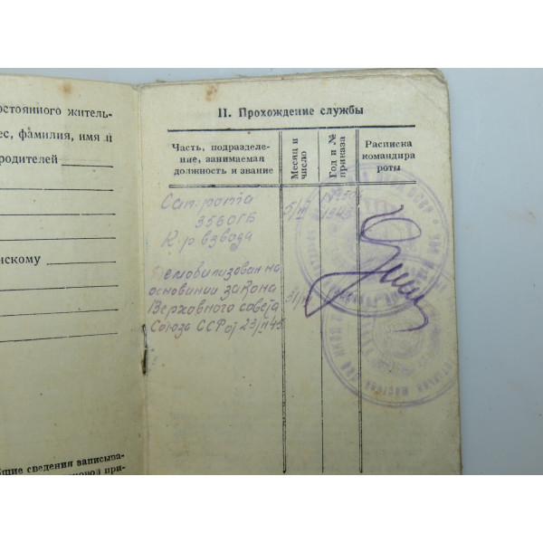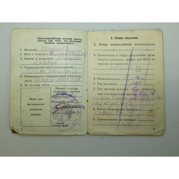 Красноармейская книжка выдана 22 августа 1945 года на Алексеева Тимофея Алексеевича старшину и командира взвода МПВО Ленинграда служившего в формировании МЛ-30 с 15 марта 1945 года по 5 июля 1943 года призванного Выборгским районным военным комиссариатом