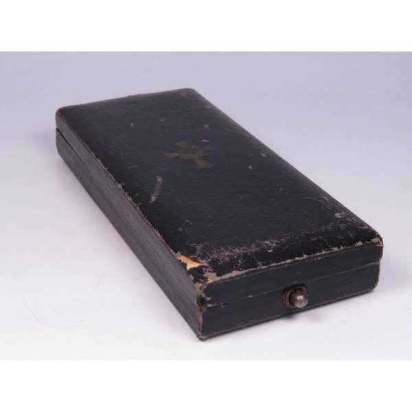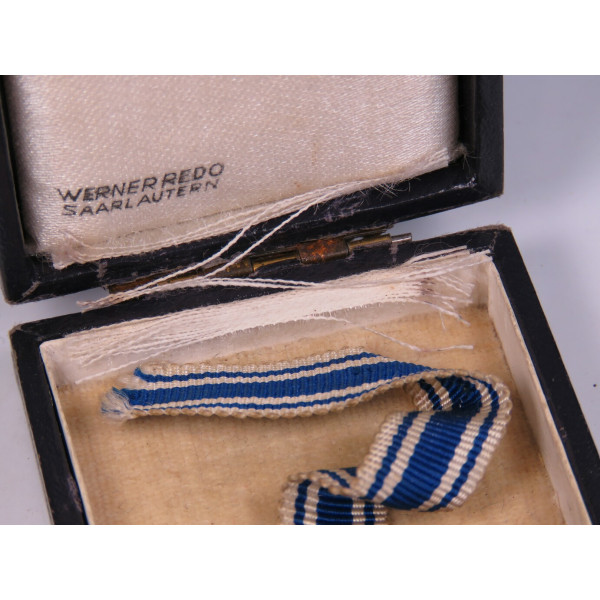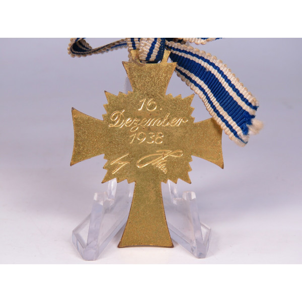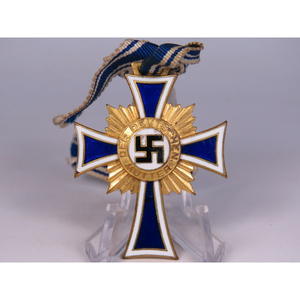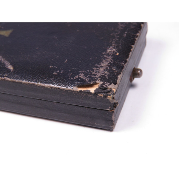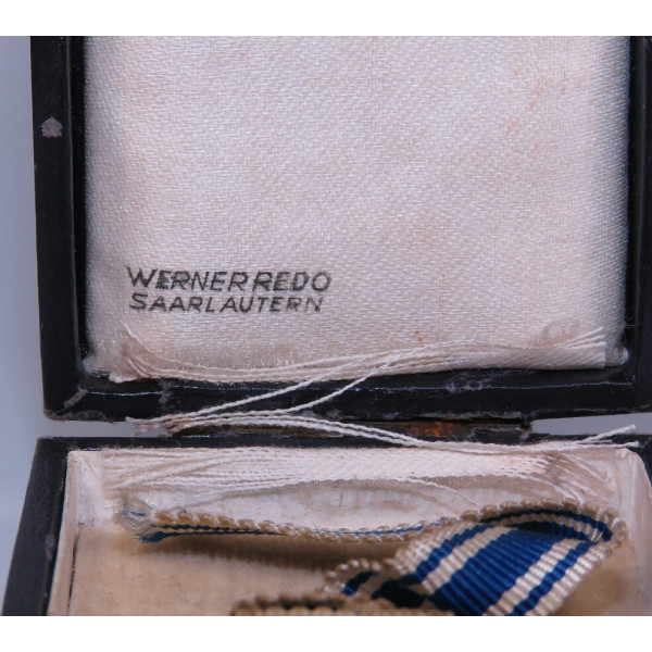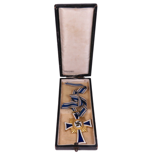 Золотая степень Ehrenkreuz der Deutschen Mutter в оригинальной коробке фабрики Werner Redo, Saarlautern. На крышке коробки нанесено фабричное тиснение с названием производителя. Внутри — шёлковая подкладка с небольшим повреждением на линии сгиба в месте закрытия. Сам крест в превосходном состоянии, эмаль без дефектов, блеск сохранился полностью