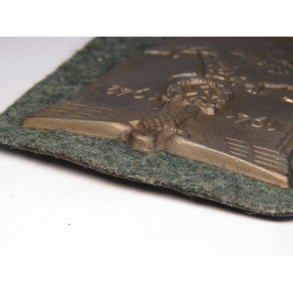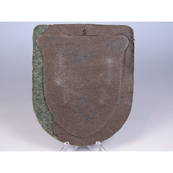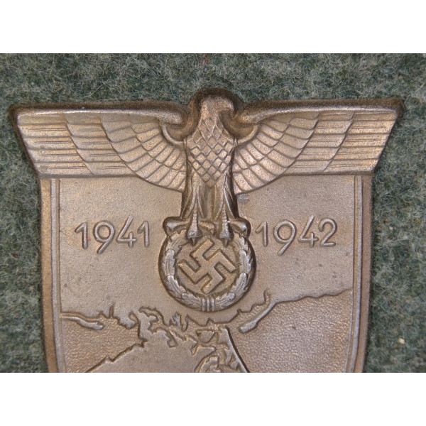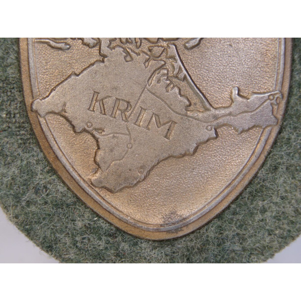 Оригинальный нарукавный щит Krimschild периода 1941–1942 года, производство фирмы Wilhelm Deumer. Щит изготовлен из цинка с полностью сохранившимся бронзированием. На лицевой стороне изображены карта Крыма, орёл со свастикой и даты 1941–1942. Щит находится в идеальном состоянии, ни разу не пришивался, без следов использования. Имеется лишь одно маленькое пятнышко в нижней части щита, не влияющее на общий внешний вид.