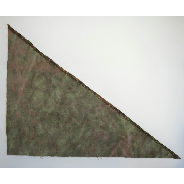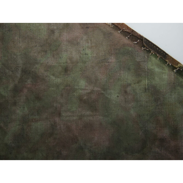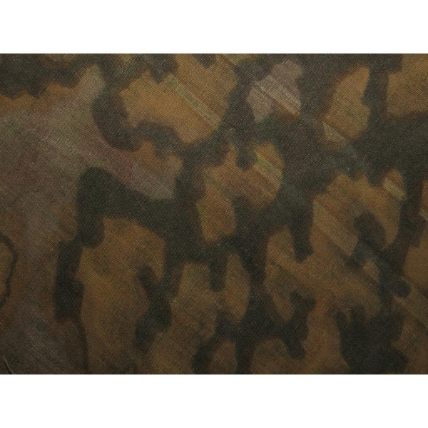 Достаточно большой кусок оригинальной камуфлированной ткани Waffen-SS с характерным рисунком Eichenlaubmuster («Дубовый лист»). Двусторонний материал, использовавшийся при производстве маскировочной униформы. Осенняя сторона отлично сохранилась, летняя — сильно вытерта, с выраженными следами полевого бытования. Представляет интерес как образец поздневойенного камуфляжа СС в насыщенном антуражном состоянии.