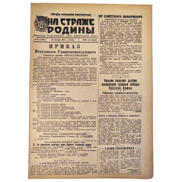 Войска Центрального фронта, продолжая стремительное наступление, форсировали реку СЕЙМ и 6 сентября освободили от немецких захватчиков города КОНОТОП, а сегодня 9 сентября после ожесточённых двухдневных боёв наши войска штурмом овладели городом БАХМАЧ — важнейшим железнодорожным узлом, имеющим крупное коммунальное и региональное значение пунктом обороны немцев на Киевском направлении.