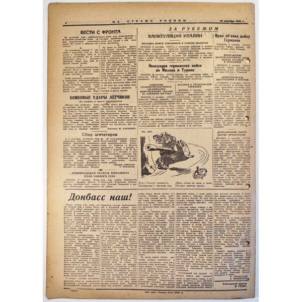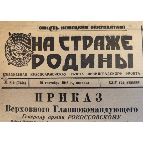 № 212 (7444) 10 сентября 1943 г., пятница XXIV год издания