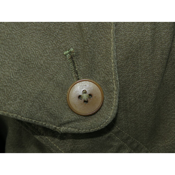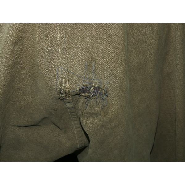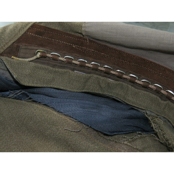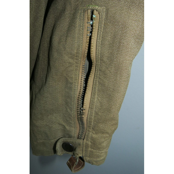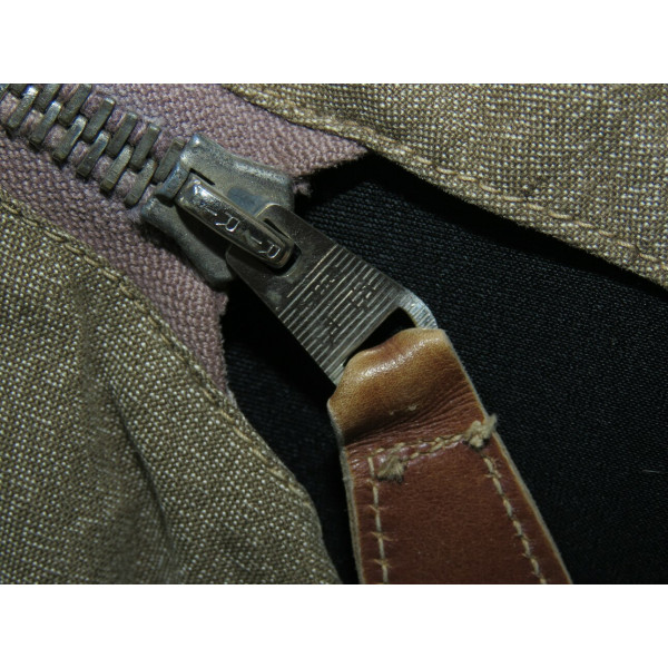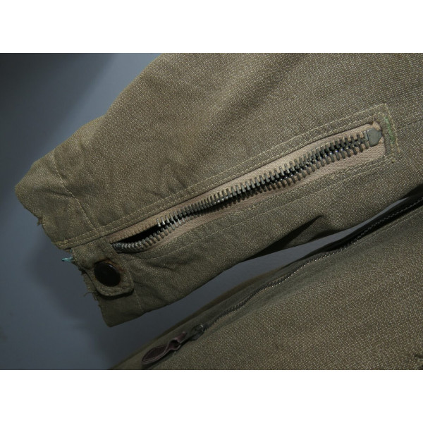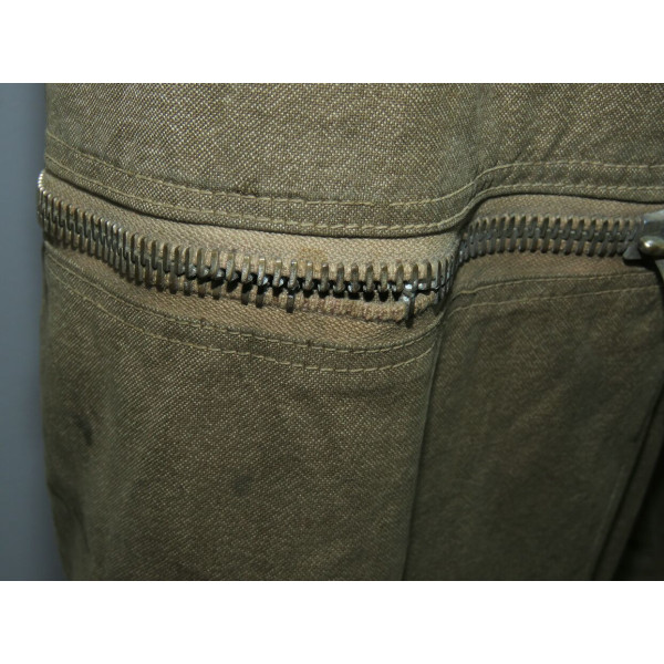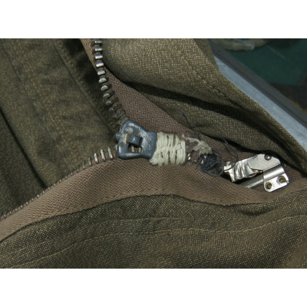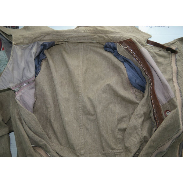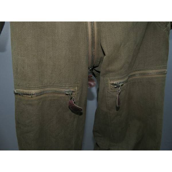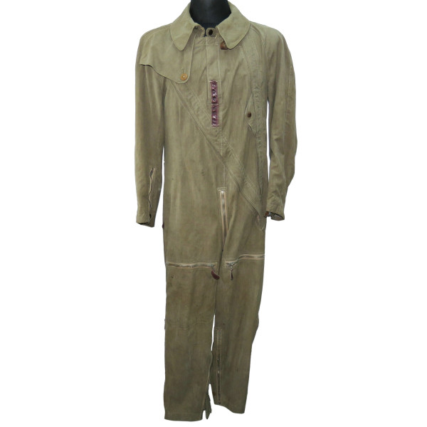 Лётный комбинезон Люфтваффе, выполненный из плотного хлопчатобумажного материала GrünMilliert (меланж). Комбинезон имеет характерный диагональный застёжной ряд на молнии, усиленные вставки из коричневой кожи в области груди и замков, а также длинные молнии на рукавах и внизу штанин, обеспечивающие удобство при надевании поверх лётной формы. Молнии на рукавах, внизу штанин и на правом боковом кармане повреждены и не функционируют, остальные — хоть и имеют следы повреждений, но до сих пор работают. Сзади, в области сиденья, имеется заштукованное повреждение. Следы бытования и эксплуатации придают изделию подлинный исторический облик. Комбинезон применялся пилотами и экипажами Люфтваффе в первые годы Второй мировой войны, особенно в бомбардировочных и разведывательных частях.