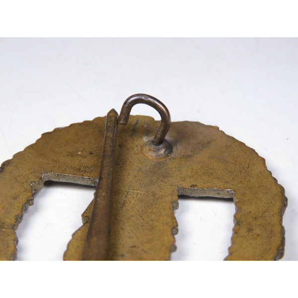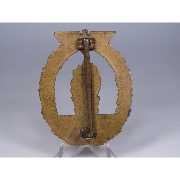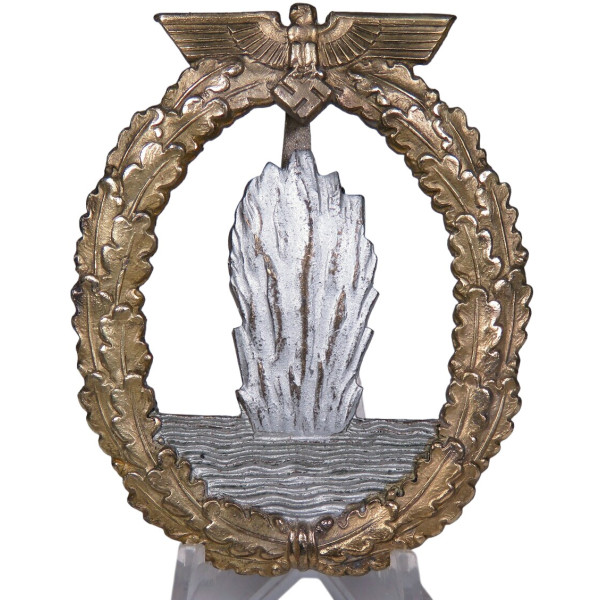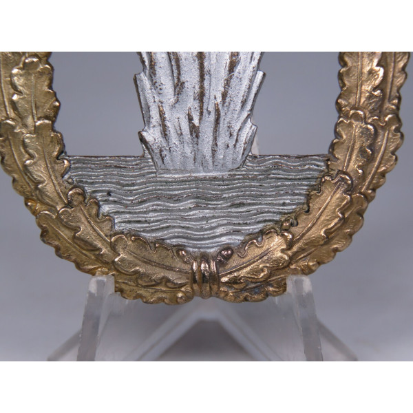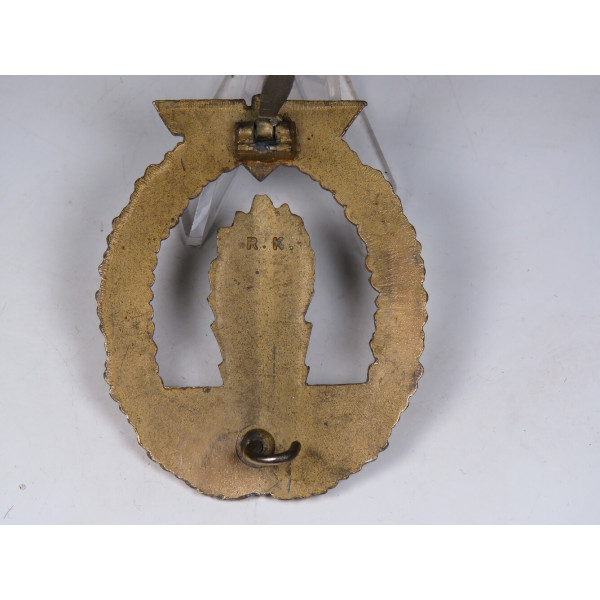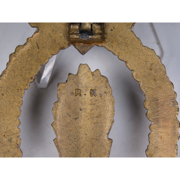 Знак минного тральщика Kriegsmarine (Minensucherkriegsabzeichen) производства Rudolf Karneth & Söhne (R.K.). Изготовлен из цинка, с плотным сохранившимся покрытием и выразительным золочением венка. Поверхность воды и столб взрыва покрыты алюминиевой пудрой, почти полностью сохранившей исходный блеск. На реверсе под иглой клеймо R.K. Состояние превосходное: чёткий рельеф, равномерная патина.